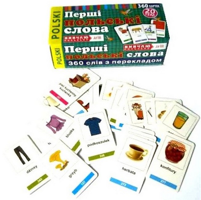 Цей набір із 360 окремих демонстраційних карток з основною лексикою призначений для тих, хто починає вивчати польську мову. Кожна картка містить кольорову ілюстрацію та польське слово-назву, а на звороті – його переклад.